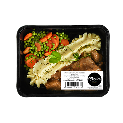 )Morceaux tendres de bœuf dans une sauce riche et épicée, accompagnés d’une purée onctueuse et d’un mélange coloré de carottes et de petits pois. Un grand classique réconfortant, avec le goût de la maison, prêt en un rien de temps.