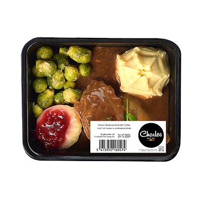 )Faisan à la brabançonne agrémenté de chicons braisés bien de chez nous, de poires à la sauce aux airelles et de purée. Un véritable classique belge à déguster en automne, en hiver et durant les fêtes. Uniquement disponible de début octobre à fin décembre.