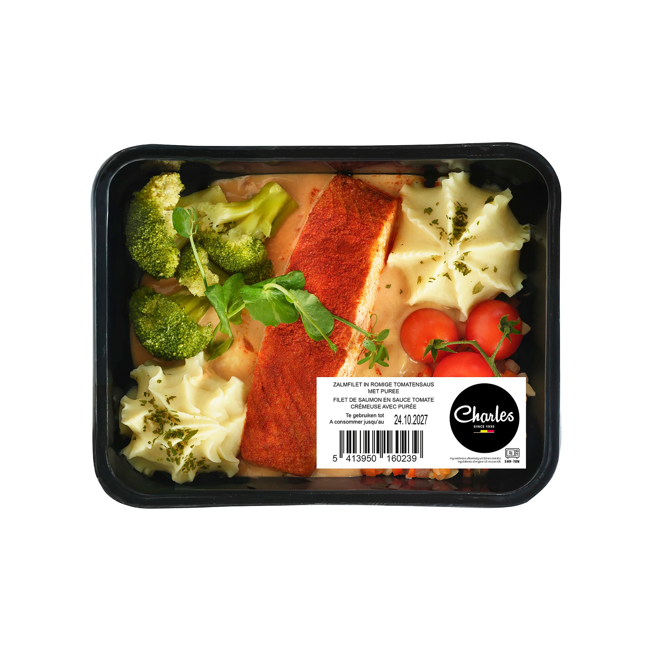 )Un succulent morceau de cabillaud servi avec une sauce légèrement tomatée, de la purée de pommes de terre et des brocolis, le tout garni de tomates cerises.