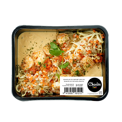 Une délicieuse association de gros scampis croustillants, de linguine dans une sauce crémeuse au vin blanc, de ciboulette et de tomates séchées.