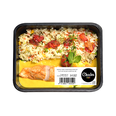 Un filet de poulet légèrement rôti accompagné de riz basmati, de morceaux de carotte, de maïs, de petits pois dans une douce sauce au curry.