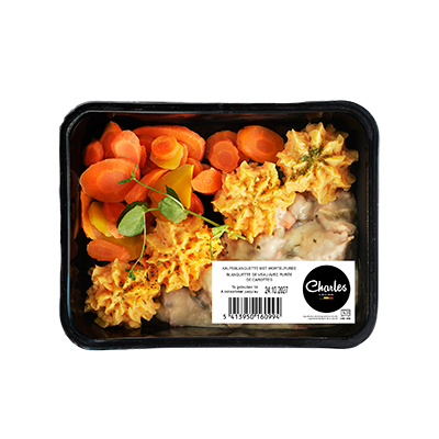 )Une blanquette de veau à base de pure viande de veau plongée dans une sauce crémeuse composée de fond de veau, de champignons, de céleri, beaucoup de carottes, de petites boulettes de viande hachée et du purée de pommes de terre.