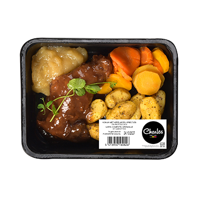 )Délicieux lapin à la façon de grand-mère avec de douces prunes, servi avec des pommes de terre rissolées dorées, une compote de pommes onctueuse et de savoureuses carottes. Un classique chaleureux et authentique, comme à la maison.