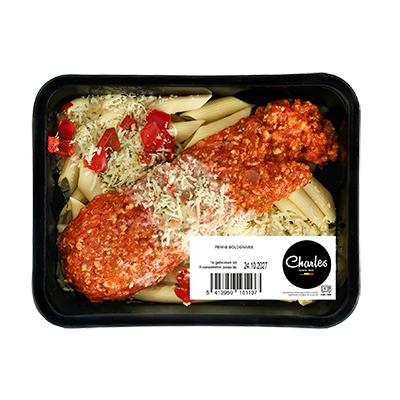 )Lekker verse Italiaanse penne, vergezeld door onze onovertroffen huisgemaakte bolognaisesaus op basis van vers varkensgehakt, heerlijke fijngesneden groentjes, tomatensaus en geraspte kaas.