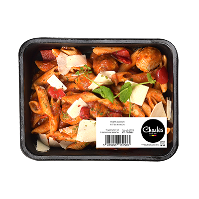 )Heerlijke penne met sappige gehaktballetjes in een rijke, licht pittige tomatensaus, afgewerkt met fijne kaasschilfers. Een smaakvolle klassieker boordevol karakter. Vers bereid en klaar om van te genieten, zoals bij de Italiaan om de hoek.