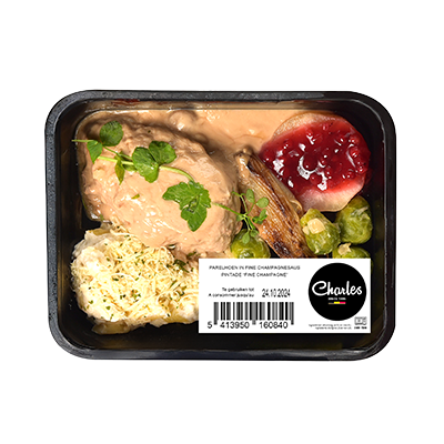 )Parelhoen Fine Champagne met appeltje-veenbes, spruitjes en gratin. Feestelijk, verfijnd en vol smaak. Enkel verkrijgbaar van 15/10-15/01.
