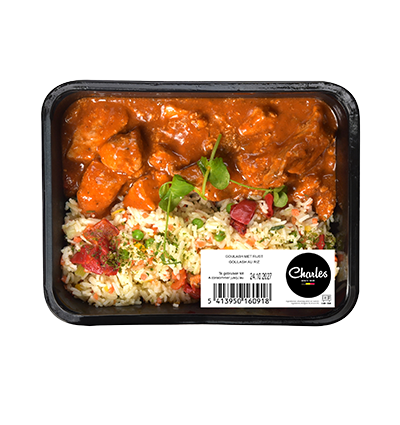)Heerlijke goulash, gemaakt met zuiver varkensvlees, paprika's, tomaten en champignons. Geserveerd met basmatirijst, stukjes wortel, maïs en erwtjes.