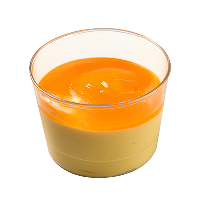 )Glaasje gevuld met vegan mangomousse, afgewerkt met een vegan gelei van tropisch vruchten.