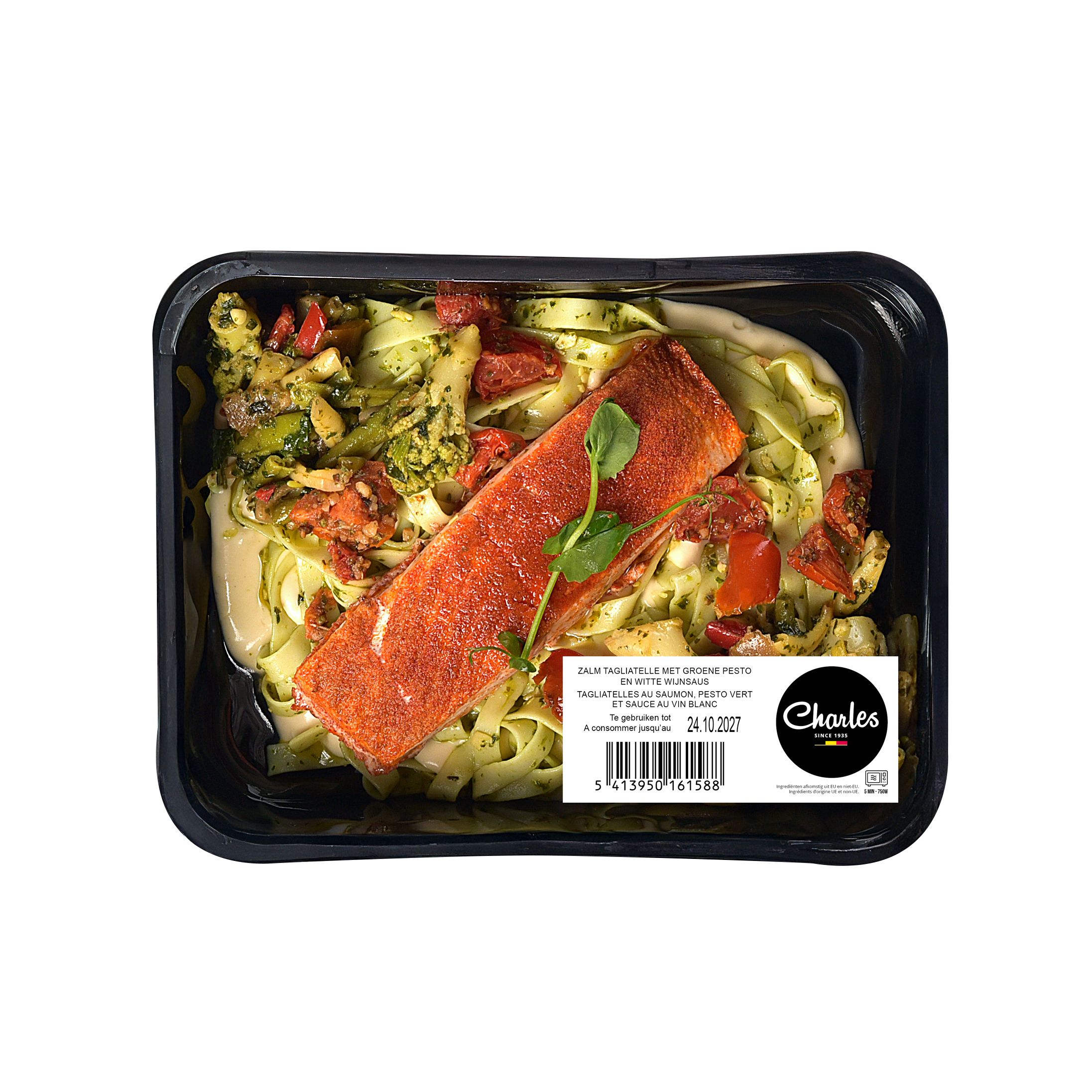 )Heerlijk gebakken zalm met tagliatelle gemengd met groene pesto, geserveerd met een romige witte wijnsaus en een frisse groentenmix.
