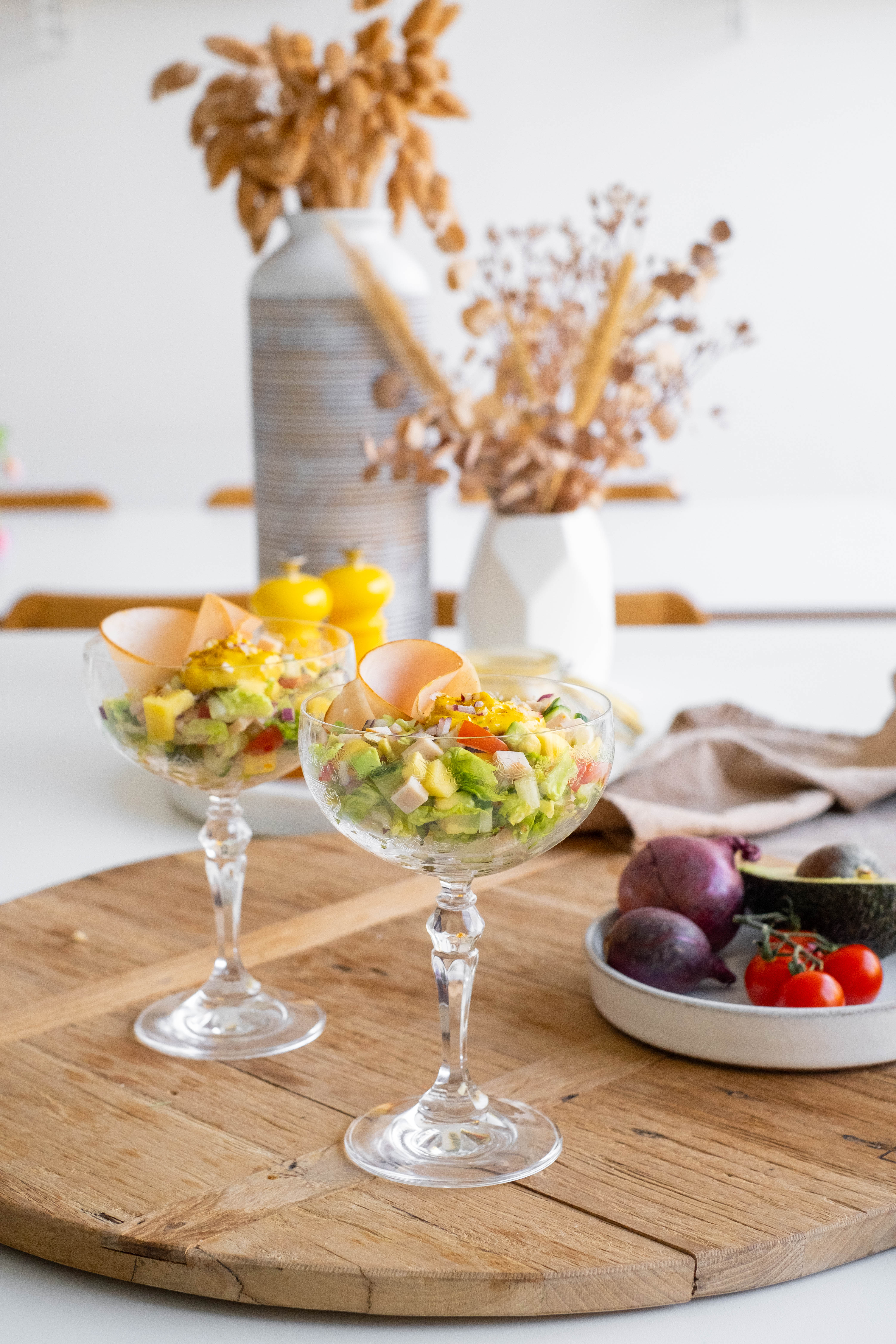 Stéphanie Bex ontwikkelde voor onze deze stijlvolle kipcocktail. De kipcocktail combineert de zachte smaak van kip met frisse groenten, romige avocado en een exotisch tintje dankzij de mango. De currymayonaise zorgt voor een verrassend kruidige toets. Ideaal om stijlvol te serveren in glaasjes als starter voor een diner met vrienden of familie!